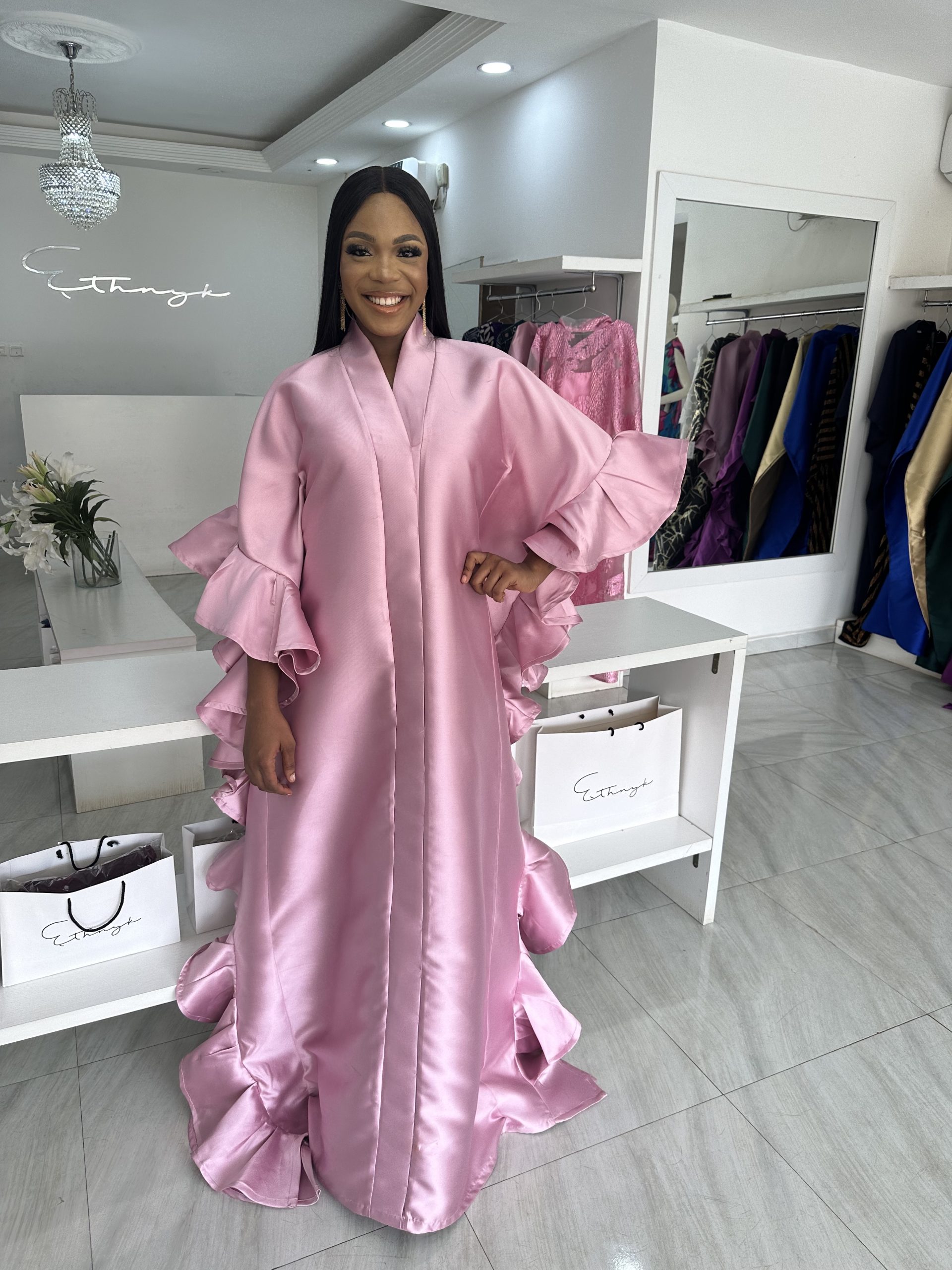 Elegant and Stylish. The Ebun Luxe Kaftan features a Pink elegant fabric with a neckline that adds a touch of allure and sophistication to the outfit. Its versatile design makes it suitable for various occasions. Whether you’re going for a casual or formal look. Our Ebun luxe kaftan makes a statement while being comfortable and versatile. The ruched border adds a touch of texture and dimension to the garment. Whether you are attending a special event or want to elevate your everyday look, this kaftan is a fabulous choice. It comes in various sizes and lengths to cater to different body types and preferences. So you can find a kaftan that fits you perfectly, whether you’re petite, plus-sized, or somewhere in between.
