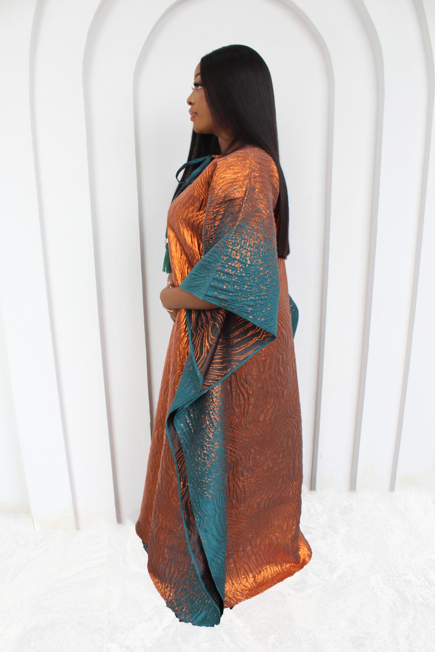 Elegance with a touch of bohemian flair. Our Enewa Brocade kaftan features a luxurious Orange and Green fabric that drapes beautifully. It gives a flattering flowing silhouette to all body types. The standout feature of this kaftan is its tassel-adorned rope neckline. Which brings a playful and fanciful element to the design. Whether you’re dressing up or keeping it casual, this kaftan is perfect for any occasion. It offers an effortless style and sophistication with a unique twist. It comes in various sizes and lengths to cater to different body types and preferences, so you can find a kaftan that fits you perfectly, whether you’re petite, plus-sized, or somewhere in between.