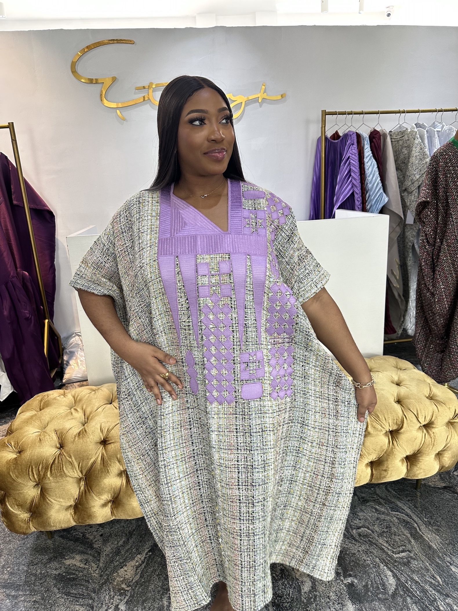 This elegant Purple Tweed Agbada Kaftan features a rich blend of woven textures paired with a bold emerald panel and intricate geometric embroidery. The loose, flowing silhouette offers effortless comfort while maintaining a sophisticated, high-end look. Side pockets add a practical touch, making it perfect for both casual elegance and special occasions. It comes in one size and midi lengths to cater to different body types and preferences. So you can find a kaftan that fits you perfectly, whether you’re petite, plus-sized, or somewhere in between.